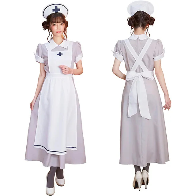落ち着いたカラーで上品なナース衣装。露出を気にせず着られるロング丈!淡いグレーにネイビーの差し色が上品なデザイン。反り返った袖口が細見えのポイント♪大きめのナース帽で小顔効果も◎