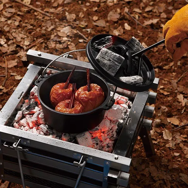 | キャンプ用食器の素材 | 本体・フタ:黒皮鉄板4.5mm厚を加工・クリアラッカー焼付塗装 ツル:ステンレス鋼 |