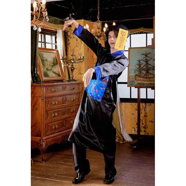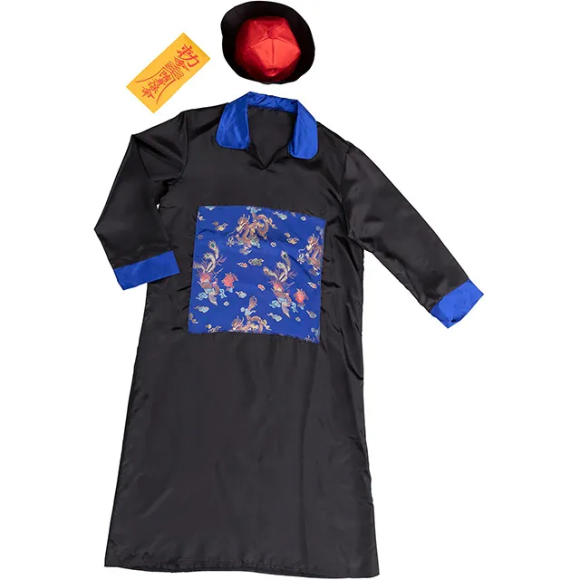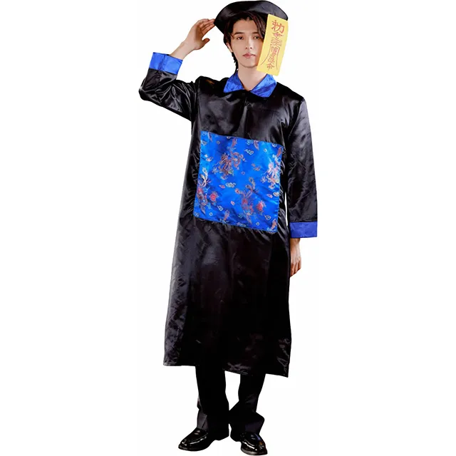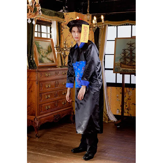 ハロウィンにおすすめ!キョンシーコスチューム。女性用・子ども用もあるので、みんなでお揃いで楽しめる!オリジナルデザインの定番キョンシーコスチューム。お札はフェルト地にプリントしてあり、面ファスナーで取り外し可能です。ダークなメイクを合わせると雰囲気が出せます。大人数で揃えれば盛り上がること間違いなしです。