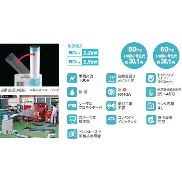 屋内・屋外問わず、いつでもどこでもすぐに冷たい風を感じられるナカトミのスポットクーラーです。一般家庭用の100V電源なので、電源さえ確保できれば工場や事務所、屋内外のイベント会場など様々な場所で活躍できます。また、キャスター付きで移動も楽々。前輪にはストッパーが付いているので、安心して使用できます。自動首振り機能でワイドな範囲に冷たい風を送ることも可能。4L排水タンクは引き出すだけで簡単に排水作業ができます。防水機能はございませんので、雨天時での屋外使用は故障の原因となりますのでご遠慮ください。また、電力(起動電力)が大きいため発電機での使用もご遠慮ください。